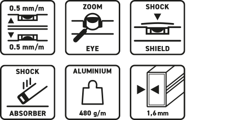 Konstrukce je lehká, ale robustní – hliníkový profil s výškou 60 mm a tloušťkou stěny 1,6 mm nabízí ideální rovnováhu mezi pevností a snadnou manipulací. Gumové, nárazuvzdorné koncovky chrání profil i libely před poškozením. Přesnost je < 0,5 mm/m, a to i při měření nad hlavou, což činí tento nástroj vhodným pro široké spektrum stavebních a řemeslných prací.